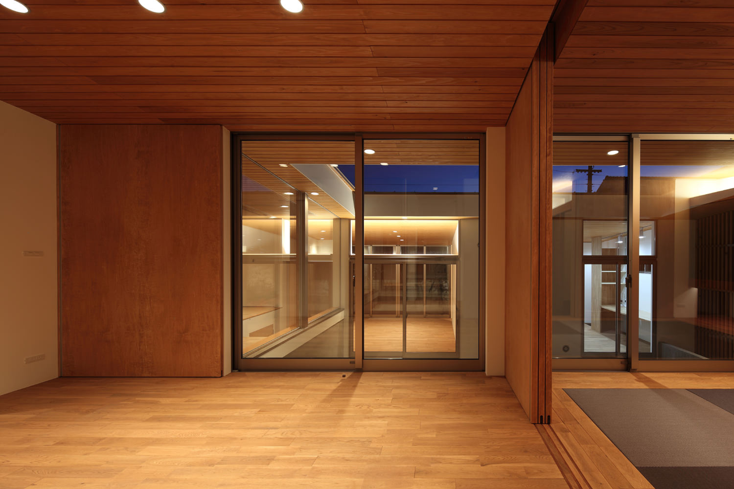 建物北側には、親世帯のエリアと、洗面、浴室、トイレがあります。建物中央部分には、子世帯のダイニングとキッチン、和室があり、各世帯が集まって食事などができるようになっています。子世帯のエリアの真ん中にも中庭があり、光と風を導き、愛犬が自由に遊ぶことが出来るスペースになっています。