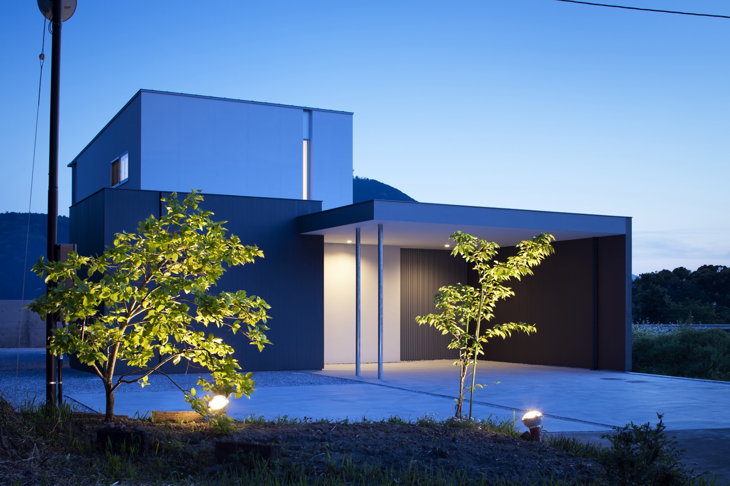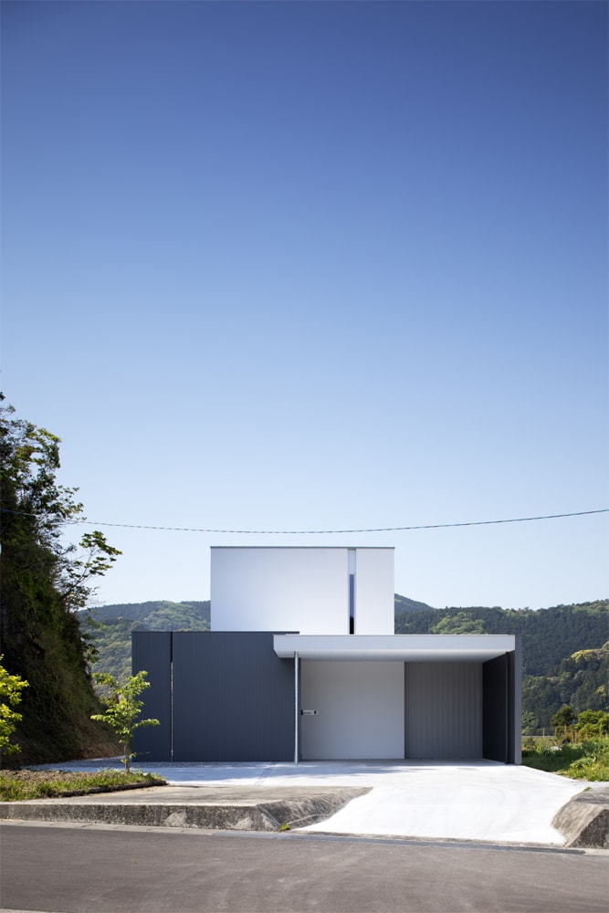 様々な検証をした結果、外への開き方を変えた4つの箱(Box)を積み重ねるように空間をつくっています。ガレージは庇に覆われ、雨の日でも濡れずに家の中に入れるオープンな箱。玄関は道路から見えないように少し閉じた箱、LDKに入れば南に広がるオープンな箱、2階は北側に少し開くスリットと南に開いた箱。4つの箱が閉じたり開いたりしながら、静かな環境と明るさを両立させた住宅になっています。